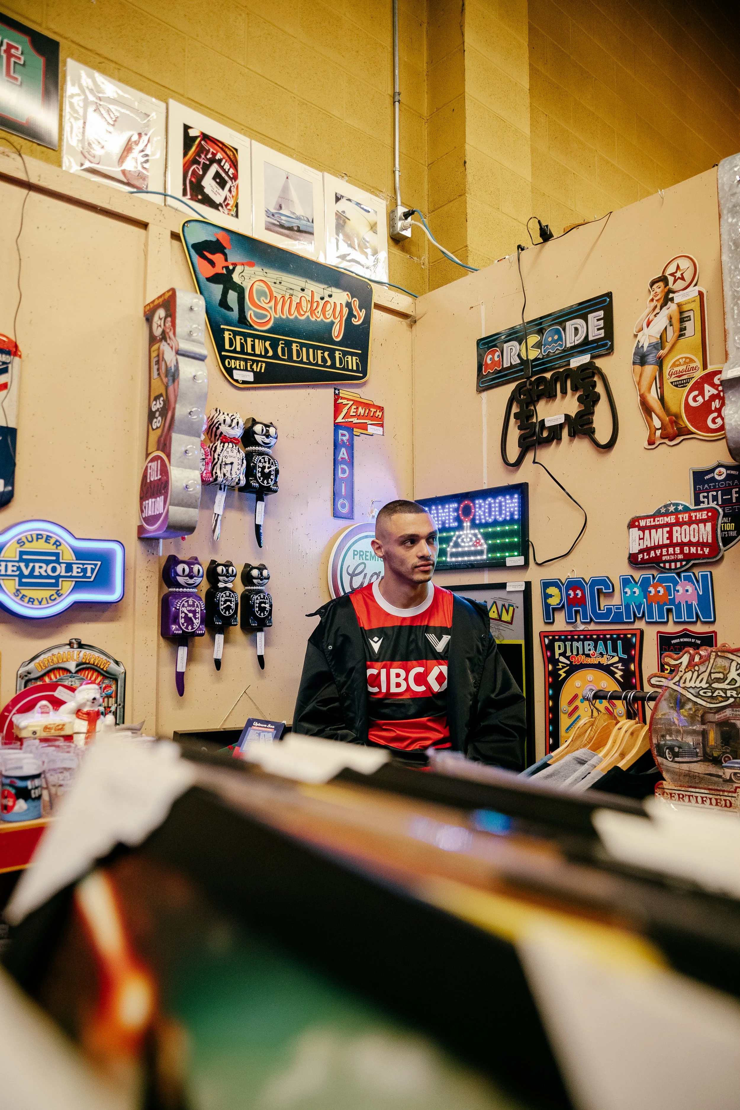 A young man with buzz cut hairstyle wearing a black jacket over a red and black sports jersey, standing inside a retro-themed game room with neon signs and vintage signs on the walls, surrounded by arcade memorabilia.