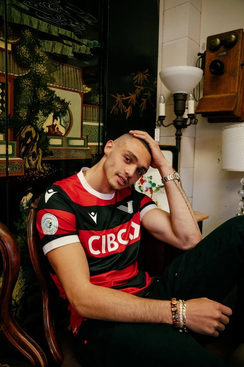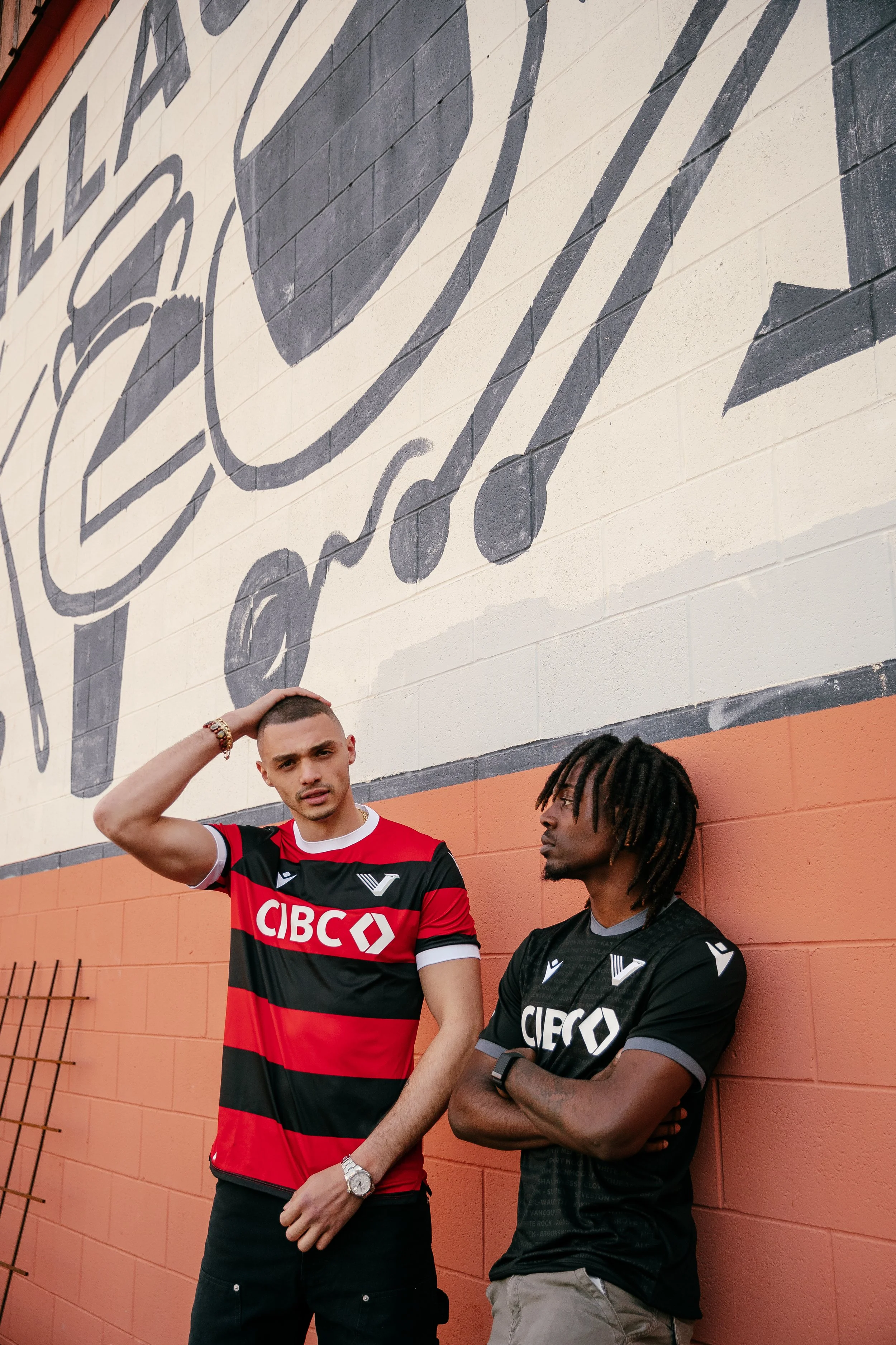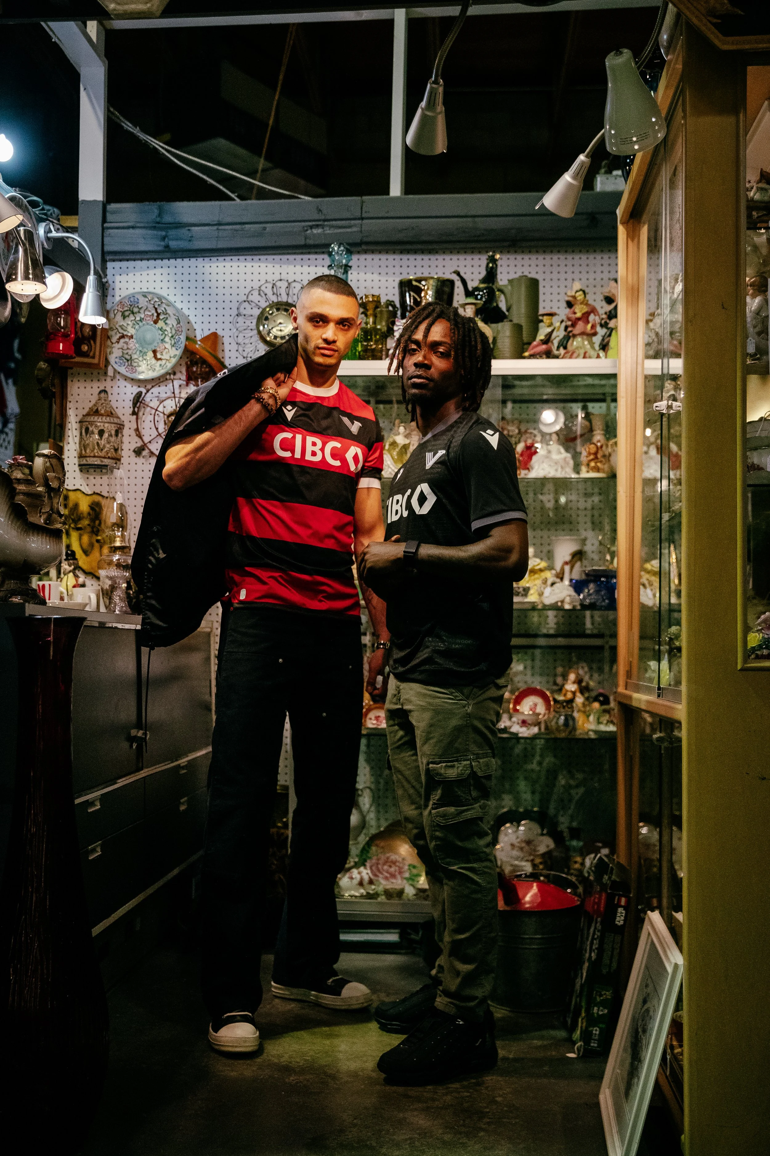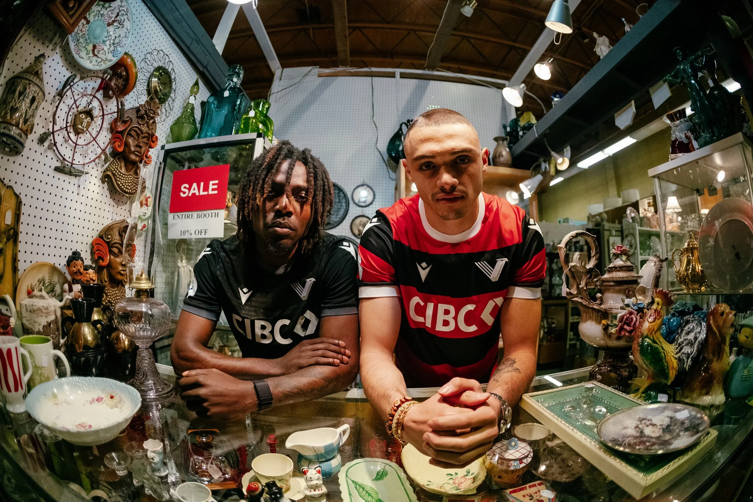 Two young men wearing Vancouver Whitecaps soccer jerseys standing against a brick wall with a large mural.