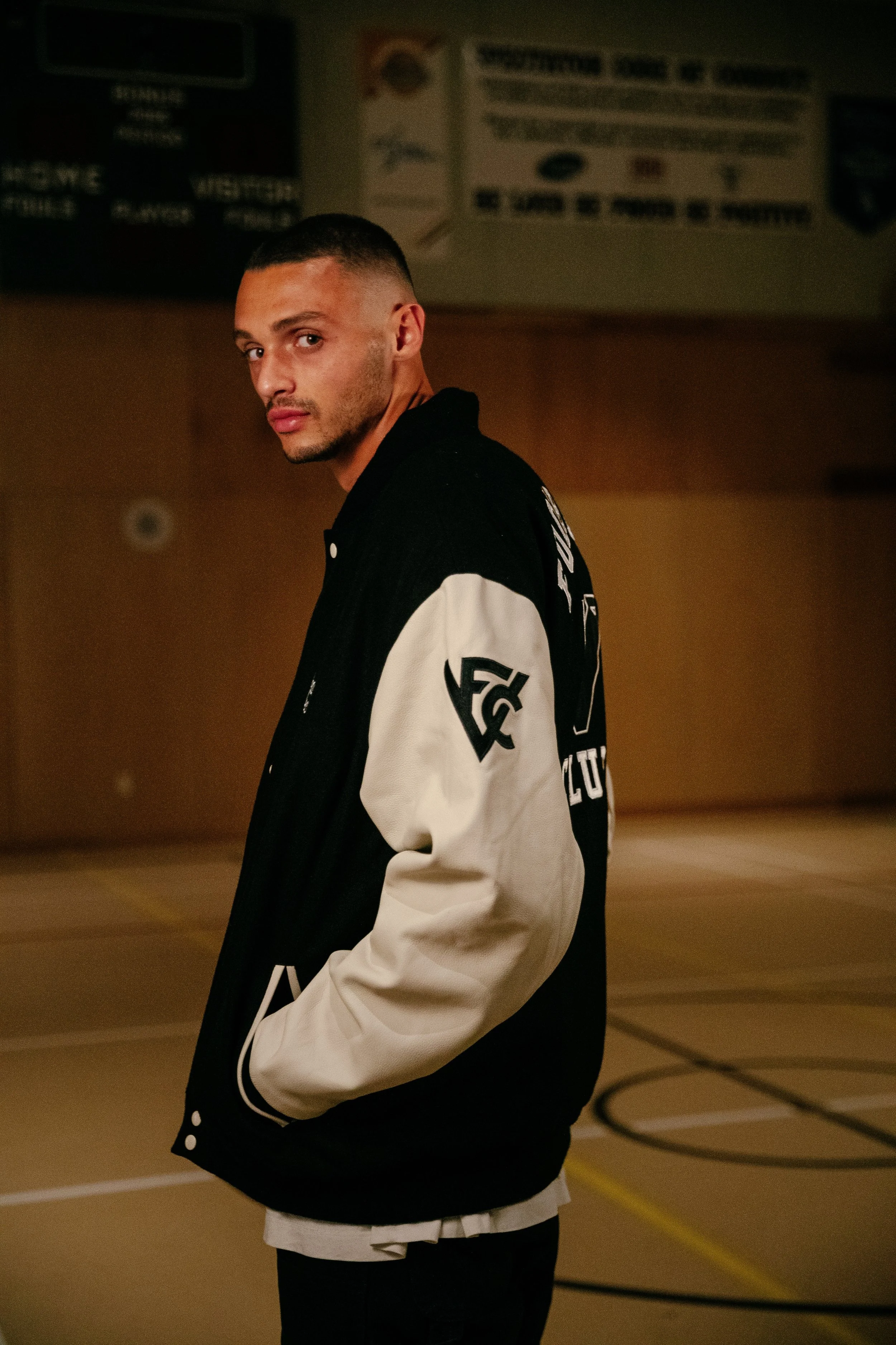 A young man with a buzz cut hairstyle in a black and white varsity jacket, standing in a gymnasium.