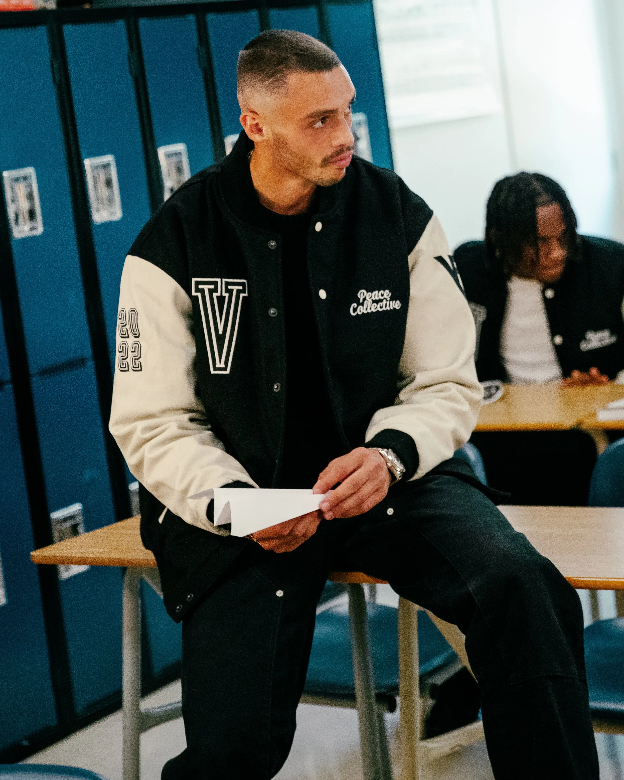 A young man sitting on a desk in a classroom, holding a paper, wearing a black and white varsity jacket with patches. In the background, another person is sitting at a table with lockers behind.