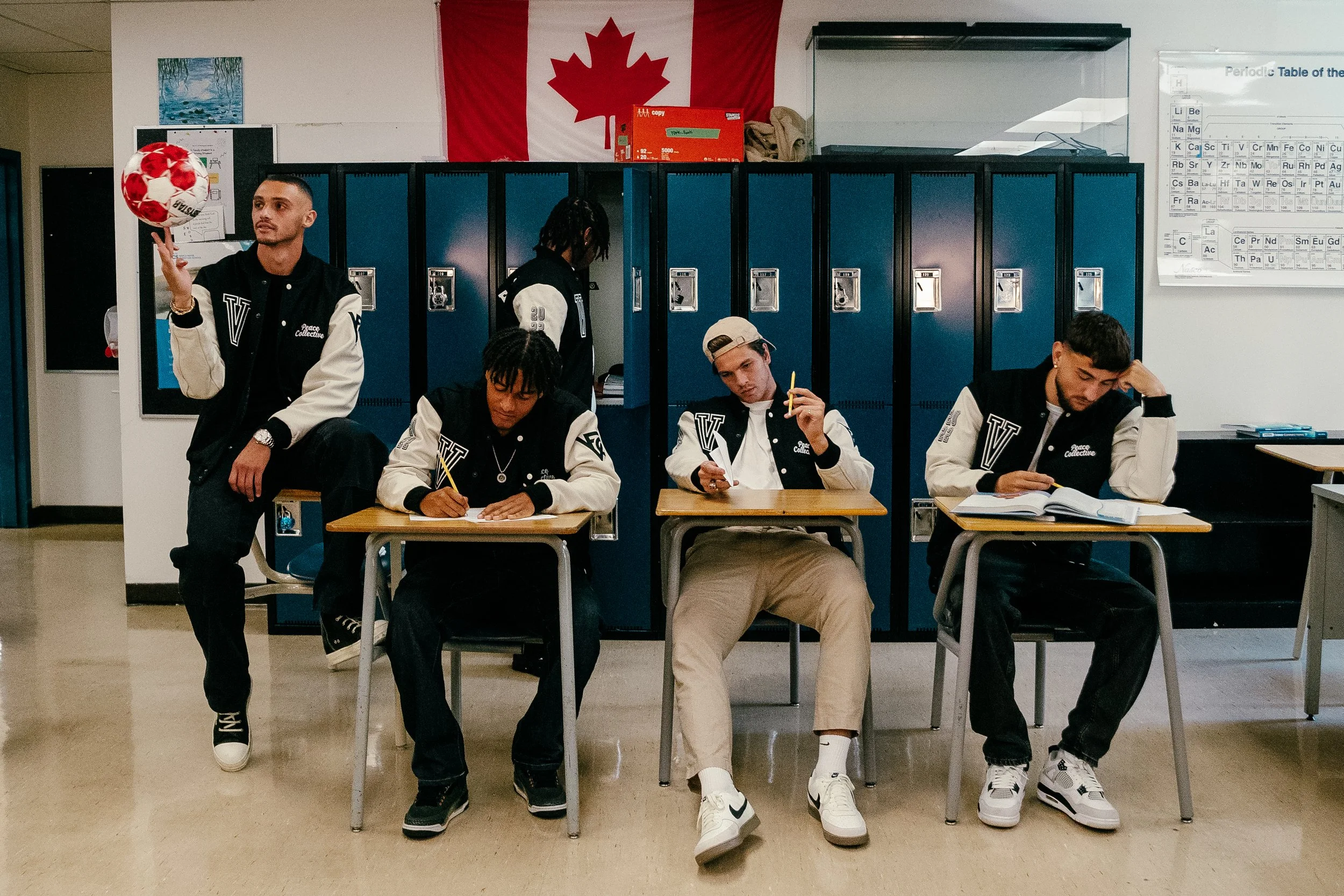 Four young men in black and white varsity jackets sitting at desks in classroom, one standing and tossing a red and white basketball, lockers and Canadian flag in background.