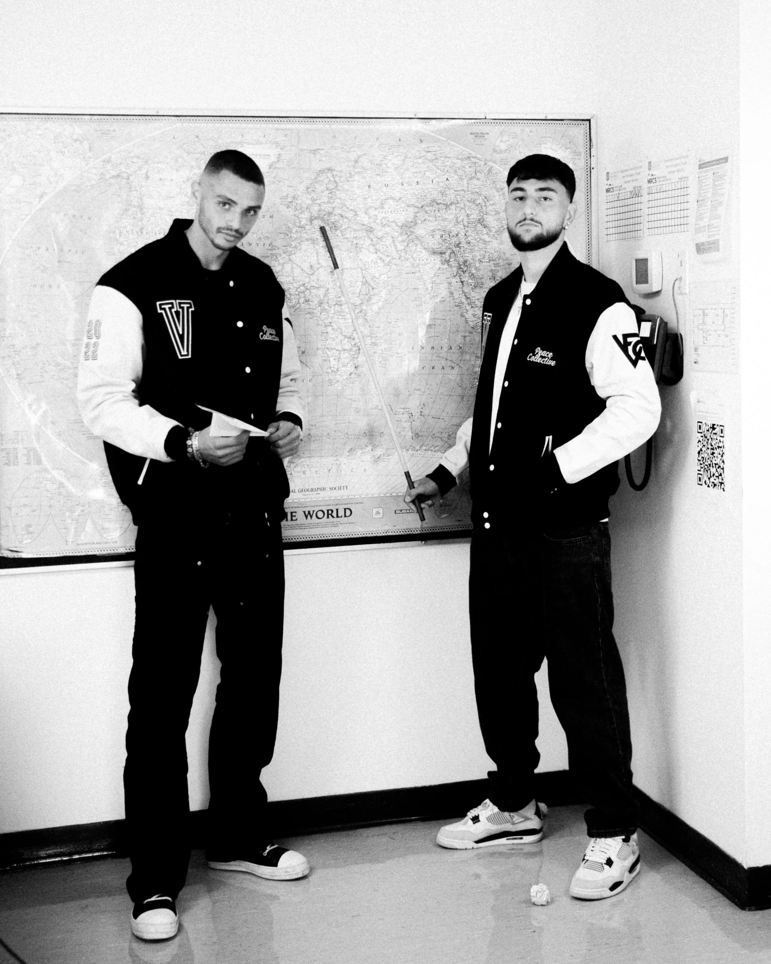 Two young men in varsity jackets standing in front of a world map in a classroom, with one holding a pointer and the other holding a piece of paper.